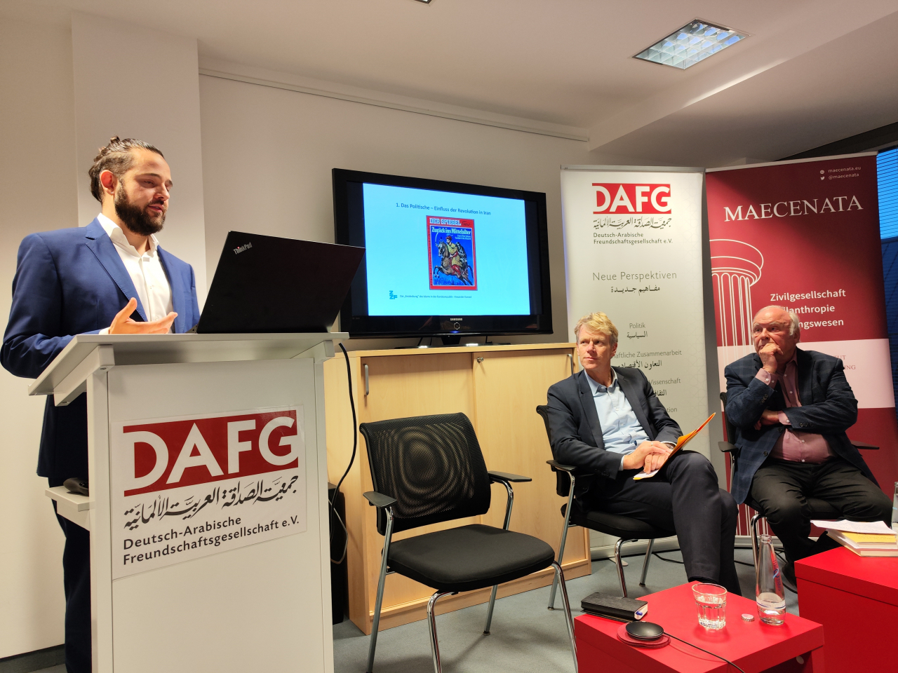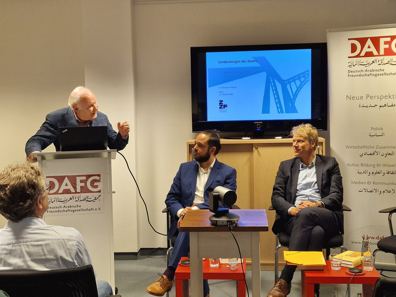 Die öffentliche Wahrnehmung des Islams in Deutschland hat nachhaltige Auswirkungen sowohl auf die außenpolitischen Beziehungen als auch auf die Stellung der Musliminnen und Muslime in der Innen- und Gesellschaftspolitik. ZZF-Historiker Dr. Alexander Konrad erkennt in der islamischen Revolution in Iran einen Wendepunkt. Die zentralen Thesen seines Buches Umdeutungen des Islams (Wallstein Verlag, 2022) griff der Autor im Gespräch mit Prof. Dr. Udo Steinbach (Leiter des MENA Study Centre der Maecenata Stiftung und Vorstandsmitglied der DAFG e.V.) auf und erörterte diese mit Blick in die Gegenwart. Professor Frank Bösch, Direktor des ZZF Potsdam, moderierte die Veranstaltung in der DAFG in Berlin.