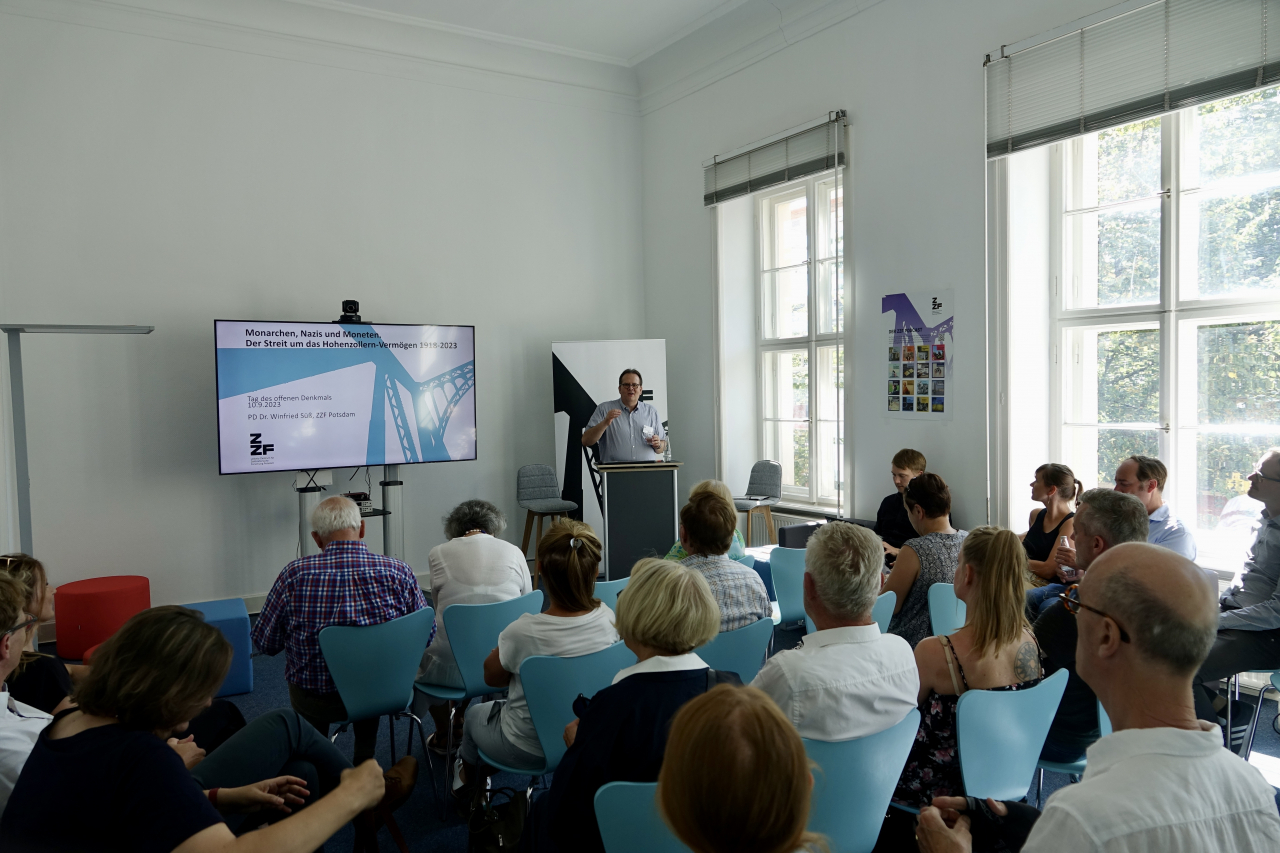 Am 10. September 2023 öffneten deutschlandweit tausende Monumente zum Tag des offenen Denkmals® ihre sonst teils verschlossenen Pforten. Das ZZF ludt in diesem Jahr erstmals zu Kurz-Vorträgen und Rundgängen im historischen Hauptgebäude des Instituts ein. Zudem nahmen Anja Tack und Josephine Eckert die zahlreichen Besucherinnen und Besucher mit auf einen Hörspaziergang durch Potsdams Innenstadt und fragten, ist das »echt authentisch«?