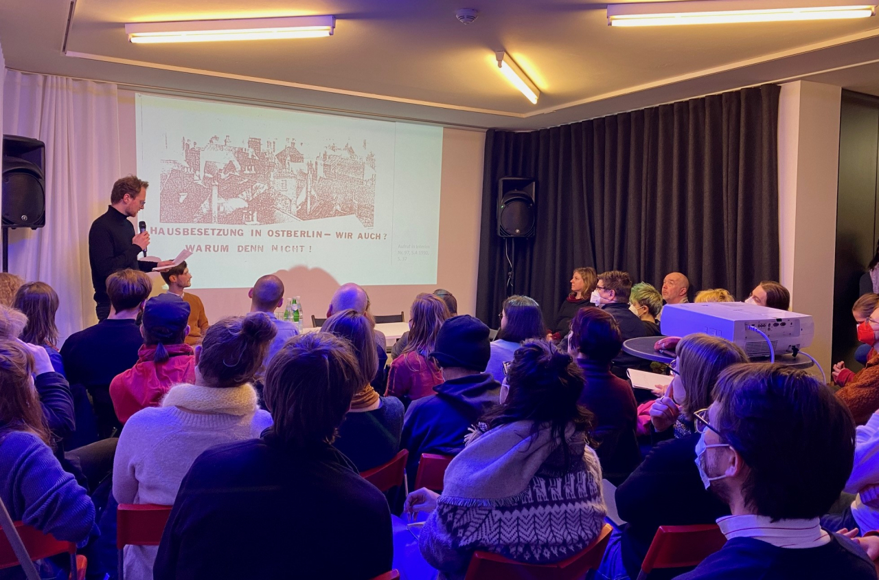 Gegenstand der Veranstaltung war die Mainzer Straße in Berlin-Friedrichshain, die heute als Mythos gilt.