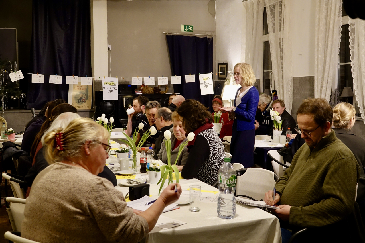 Die Dialogreise der von Kerstin Brückweh geleiteten ZZF-Forschungsgruppe »Die lange Geschichte der ,Wende‘« führt durch drei Bundesländer: In Brandenburg, Sachsen und Thüringen stellten die Forscher*innen ihre ersten Ergebnisse vor. Ziel der Gesprächsreihe ist es, im Sinne des Ansatzes der »Citizen Science – Bürger schaffen Wissen« mit Zeitzeug*innen ins Gespräch zu kommen und sie aktiv in den Forschungsprozess einzubinden. Nach einer Vorstellung des Forschungsteams und einer kurzen Präsentation der vorläufigen Ergebnisse hatten die Gäste die Möglichkeit, sich in kleineren Gesprächsrunden mit den Historiker*innen zu unterschiedlichen Fragen und Themen auszutauschen. Während in Meiningen die Erinnerung an die Schulzeit im Mittelpunkt stand, so ging es in Garrey u.a. darum, ob 1989 eine Revolution oder eine »Wende« stattgefunden hat, wer die Geschichte der DDR wie schreibt, inwiefern sich unsere Arbeitsweise heute von den Methoden und Theorien der DDR-Geschichtswissenschaft unterscheidet und ob man sich im Westen Deutschlands überhaupt für den Osten interessiert.