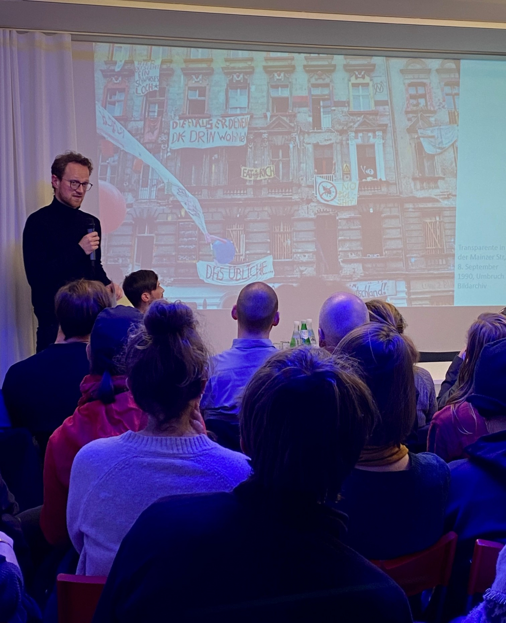 Gegenstand der Veranstaltung war die Mainzer Straße in Berlin-Friedrichshain, die heute als Mythos gilt.