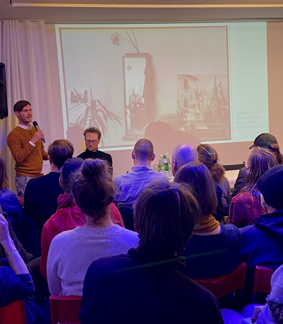 Tom Koltermann (ZZF) und Jakob Saß (ZZF) hielten gemeinsam einen Vortrag über Hausbesetzungen in Ost-Berlin.